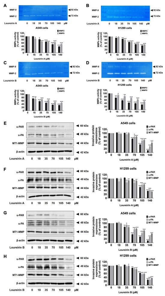 Loureirin A and Loureirin B reduced the levels of invasion-related proteins in NSCLC cells. A549 and H1299 cells were treated with 0–140 µM Loureirin A or B for 48 h. MMP-9 and MMP-2 activity was assessed via gelatin zymography (A–D), while u-PAR, u-PA, and MT1-MMP expression was analyzed by Western blotting (E–H). Data from the control group (0 µM) were set to 100% to calculate the percentage of protein expression. Results are expressed as mean ± S.D. * p < 0.05, ** p < 0.01, and *** p < 0.001 compared with a control group (0 µM).