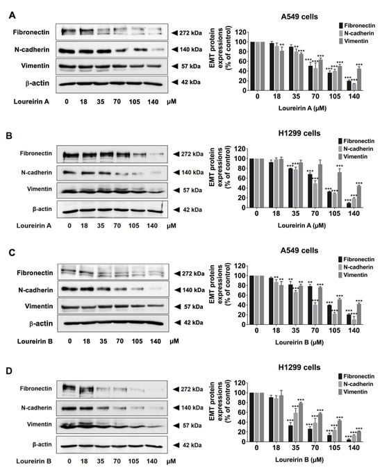 Loureirin A and Loureirin B suppressed the expression of EMT-associated markers of A549 and H1299 cells. A549 (A,C) and H1299 (B,D) cells were treated with 0–140 µM Loureirin A or B for 48 h. Fibronectin, N-cadherin, and vimentin expression were analyzed by Western blotting. Data from the control group (0 µM) were set to 100% to calculate the percentage of protein expression. Results are expressed as mean ± S.D. ** p < 0.01 and *** p < 0.001 compared with a control group (0 µM).