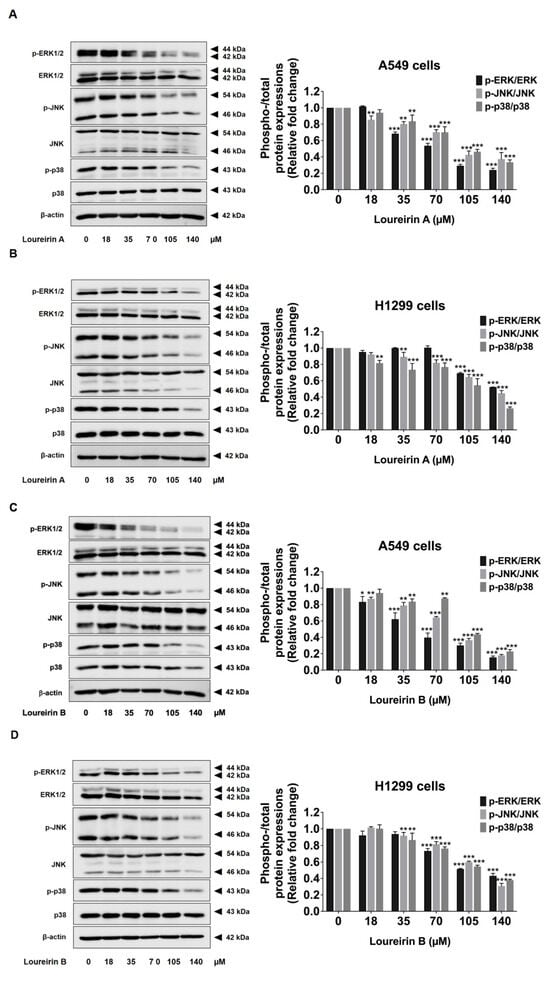 Loureirin A and Loureirin B suppressed the activation of the MAPK signaling pathway in A549 and H1299 cells. A549 (A,C) and H1299 (B,D) cells were treated with 0–140 µM Loureirin A or B for 48 h. Phosphorylation of ERK, JNK, and p38 was assessed by Western blotting. The fold change of phosphorylated/total proteins in the control group (0 µM) was set to 1 to determine the relative fold change in the treatment groups. Results are expressed as mean ± S.D. * p < 0.05, ** p < 0.01, and *** p < 0.001 compared with a control group (0 µM).