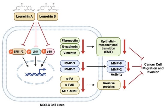 Mechanistically, we identified the MAPK signaling pathway as a key target of Loureirin A and Loureirin B. Previous studies have reported that the constitutive activation or dysregulation of MAPK signaling pathways is implicated in the initiation, progression, and metastatic spread of lung cancer []. The p38 MAPK pathway regulates cell invasion, migration, and EMT in lung adenocarcinoma []. Additionally, the ERK/JNK/p38 MAPK signaling pathways contribute to the progression and metastasis of NSCLC cells []. Aberrant activation of the MAPK signaling pathway is a characteristic feature of various cancers, including NSCLC, where it promotes EMT, cell migration, and invasion [,,]. Our study demonstrated that both compounds significantly inhibited the phosphorylation of ERK, JNK, and p38, the three major MAPK subfamilies, thereby disrupting this pathway. Figure 8 presents a schematic summary of the mechanism by which Loureirins A and B inhibit EMT, migration, and invasion in NSCLC cell lines. In addition to their impact on MAPK signaling, Loureirin A and Loureirin B may have broader implications for NSCLC treatment. Previous studies have shown that Loureirin A and Loureirin B affect multiple signaling pathways involved in cell metastasis. In various cell systems, Loureirin A has been shown to suppress MMP-9 in mouse articular chondrocytes by inhibiting the Akt/NF-κB signaling pathway [], to promote melanoma cell differentiation, and to suppress migration and invasion by inhibiting the WNT and AKT/mTOR signaling pathways []. Similarly, Loureirin B has been reported to reduce MMP-2 and MMP-9 levels and inhibit HeLa cell metastasis through inhibition of the PI3K/AKT signaling pathway []. However, our findings highlight the potential of Loureirin A and Loureirin B in modulating cancer progression in NSCLC through the MAPK signaling pathway. Inflammation plays a pivotal role in the metastatic cascade by fostering a tumor-promoting microenvironment [,]. Although not directly examined in this study, the known anti-inflammatory properties of Loureirin A and Loureirin B suggest their potential to mitigate inflammatory process that contributes to NSCLC progression. Loureirins A and B, due to their potent anti-invasion and anti-cancer properties, hold potential as valuable components in combination therapy. Their ability to inhibit key signaling pathways, such as the MAPK pathway, and suppress EMT-associated markers may enhance the efficacy of chemotherapy or improve responses to targeted therapies. However, further investigations should explore this aspect to provide a more holistic understanding of their therapeutic benefits.