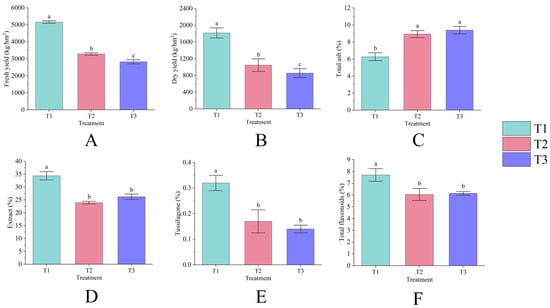 Fresh yield (A), dry yield (B), total ash (C), extract (D), tussilagone (E), and total flavonoids (F) of T. farfara flower buds across different consecutive cropping years. Lowercase letters denote significant differences between treatments (p < 0.05), and this notation is consistent throughout the text.