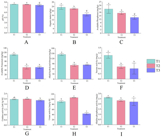 Soil pH was measured using the potentiometric method with a water-to-soil ratio of 5:1. Organic matter was quantified by the volumetric potassium dichromate external heating method. Available phosphorus was assessed using the molybdenum–antimony colorimetric method, while available potassium was measured through the ammonium acetate leaching–flame photometric method. Alkaline nitrogen was determined by the alkaline diffusion method. Sucrose enzyme activity was analyzed using the 3,5-dinitrosalicylic acid colorimetric method. Catalase activity was measured via the permanganate titration method. Urease activity was quantified using the phenol-sodium hypochlorite colorimetric method, and alkaline phosphatase activity was assessed with the sodium benzyl phosphate colorimetric method.