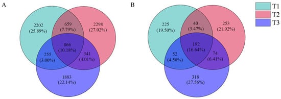 The OTU clustering analysis of the sequencing results of the rhizosphere soil bacterial community of T. farfara (Figure 3A) showed that the three treatment soil samples had a total of 866 OTUs, accounting for 10.18%; T1, T2, and T3 had 2202, 2298, and 1883 specific OTUs, respectively; T1 and T2 had 659 OTUs (accounting for 7.75%), T1 and T3 had 255 OTUs (accounting for 3.00%), and T2 and T3 had 341 OTUs (accounting for 4.01%).