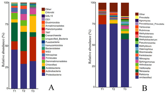 Relative abundance of bacterial species at phylum level and genus level in rhizosphere soil of T. farfara with different continuous cropping years ((A): phylum level; (B): genus level).