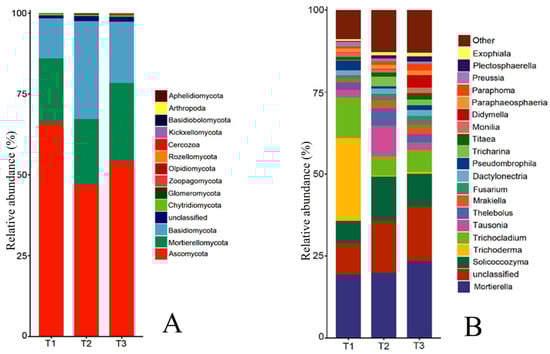 The rhizosphere soil fungal community at the phylum level mainly consisted of Ascomycota, Mortierellomycota, Basidiomycota, Fungi_unclassified, Chytridiomycota, Zoopagomycota, Glomeromycota, and Olpidiomycota (Figure 5A). The relative abundance of Zygomycota was ranked first and decreased year by year, which was 65.96%, 54.10%, and 46.80%, respectively. The relative abundance of Chytridiomycota and Zoopagomycota was 0.58%, 0.42%, and 0.49%, and 0.08%, 0.06%, and 0.21%, respectively, which also showed a decrease first and then increase with the increase in cropping years, and the relative abundance of Chytridiomycota was not significant in T1, T2, and T3, while Zoopagomycota increased 162.27% in T3 compared with T1. The relative abundance of Mortierellomycota, Fungi_unclassified, and Olpidiomycota increased gradually with the increase in cropping years, reaching 24.29%, 1.61%, and 0.20% in T3, respectively, and the relative abundance of Olpidiomycota changed the most, increasing 5.67 times in T3 compared with T1. The relative abundance of Basidiomycota and Glomeromycota was the opposite of Ascomycota, showing an increase first and then a decrease with the increase in cropping years, with the relative abundance of 12.41%, 30.19%, 18.89%, and 0.04%, 0.28%, 0.14%, respectively, all reaching the highest in T2.
