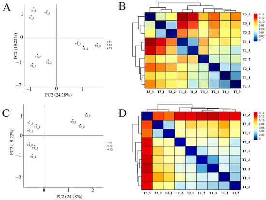 PCA analysis of rhizosphere soil bacteria and fungi sequencing results showed (Figure 6A,B) that the structure of rhizosphere soil bacterial and fungal communities in different continuous cropping years of T. farfara was zoned without overlapping parts, and the heat map of cluster analysis based on β-diversity-Weighted Unifrac distance showed (Figure 6C,D) that the bacterial and fungal communities in T1 and T2 were more similar and clustered into one group, while T3 clustered into one group alone, indicating that the microbial community structure among rhizosphere soil in different continuous cropping years differed significantly, and the differences between T1 and T2 were small and became larger with the increase in continuous cropping years.