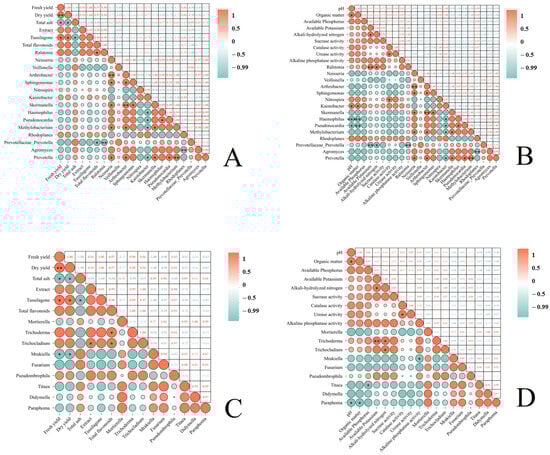 Analyzing the correlation between the relative abundance of different microbial genera in the rhizosphere soil subjected to various treatments and the yield and quality of T. farfara flower buds, as well as the soil’s physicochemical properties. (A): Correlation analysis between the yield and quality of T. farfara flower buds and the abundance of bacteria in the rhizosphere soil; (B): correlation analysis between the physicochemical properties of soil under continuous cropping of T. farfara and the abundance of bacteria in the rhizosphere soil; (C): correlation analysis between the yield and quality of T. farfara flower buds and the abundance of fungi in the rhizosphere soil; (D): correlation analysis between the physicochemical properties of soil under continuous cropping of T. farfara and the abundance of fungi in the rhizosphere soil. Asterisks denote significance levels: *** p < 0.001; ** p < 0.01; * p < 0.05.