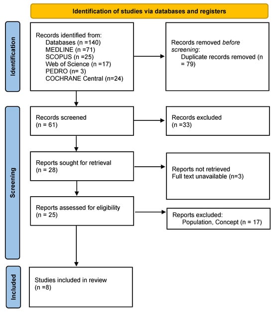 - Scopus:TITLE-ABS-KEY (“groin pain” OR “athletic pubalgia” OR “sports hernia” OR “adductor strain” OR “inguinal disruption”) AND (“conservative treatment” OR “rehabilitation” OR “manual therapy” OR “exercise therapy” OR “non-surgical management”)