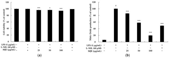 In this context, as an initial step, the cytotoxicity of MJE on RAW 264.7 cells was evaluated using the MTT assay. As is widely recognized, the MTT assay is a reliable method for assessing cell viability by measuring the ability of mitochondria in living cells to reduce the yellow, water-soluble compound MTT into insoluble purple formazan crystals [28,29,30,31]. As shown in Figure 1a, treatment with MJE (25, 50, 100 μg/mL) for 24 h in the presence of LPS (1 μg/mL) revealed no significant cytotoxicity up to a concentration of 100 μg/mL. Additionally, L-NIL (40 μM), a potent and moderately selective inhibitor of inducible nitric oxide synthase (iNOS), used as a positive control, also showed no cytotoxicity. In conclusion, based on these results, subsequent experiments were conducted using concentrations of 25, 50, and 100 μg/mL.