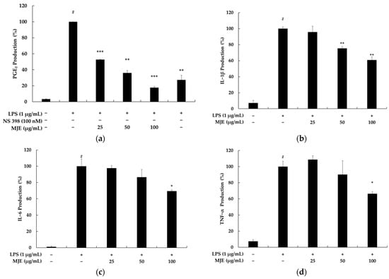 The levels of PGE2, interleukin-6 (IL-6), IL-1β, and tumor necrosis factor-α (TNF-α) in culture supernatants were quantified using ELISA kits following the manufacturer’s instructions. RAW 264.7 cells (1.5 × 10⁵ cells per well) were incubated in 24-well plates with MJE and LPS (1 μg/mL) for 24 h. To assess PGE2 levels, NS-398 (100 nM), a selective COX-2 inhibitor, was used as a positive control. Protein concentrations were determined by measuring absorbance at 405 nm or 450 nm using a Biotek microplate reader (Winooski, VT, USA).