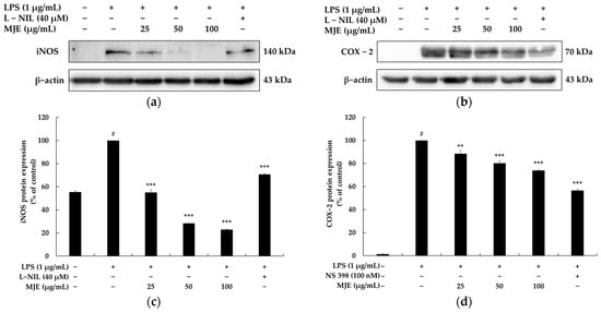 The effect of Mosla japonica extract (MJE) on iNOS and COX-2 protein expression in lipopolysaccharide (LPS)-induced RAW 264.7 cells. Cells were treated with MJE (25, 50, and 100 μg/mL) and LPS (1 μg/mL) for 22 h. (a,b) Western blot analysis of iNOS and COX-2 protein expression. (c,d) Quantification of iNOS and COX-2 protein levels. N6-(1-iminoethyl)-L-lysine (L-NIL) and NS-398 were used as positive controls for iNOS and COX-2 expression, respectively. Data are presented as mean ± SD from three independent experiments. Statistical significance: # p < 0.001 vs. unstimulated control, ** p < 0.01, *** p < 0.001 vs. LPS-only group.
