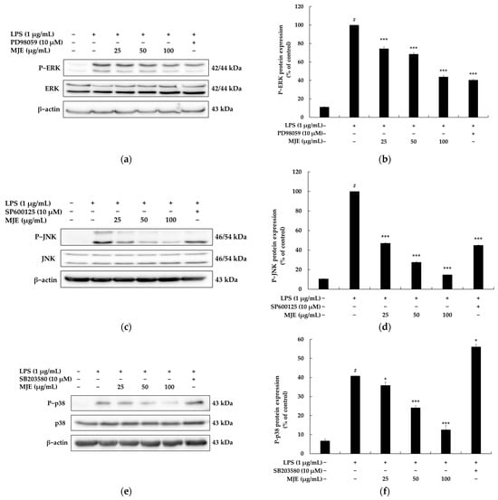 The effect of Mosla japonica extract (MJE) on the expression of phosphorylated ERK (P-ERK), JNK (P-JNK), and p38 (P-p38) proteins in lipopolysaccharide (LPS)-induced RAW 264.7 macrophage cells. Cells were treated with MJE (25, 50, and 100 μg/mL) and LPS (1 μg/mL) for 20 min. MAPK inhibitors—PD98059 for ERK, SP600125 for JNK, and SB203580 for p38—were used as controls. (a,c,e) Western blot analysis of P-ERK, P-JNK, and P-p38 protein expression. (b,d,f) Quantification of P-ERK, P-JNK, and P-p38 protein levels. Data are presented as mean ± SD from three independent experiments. Statistical significance: # p < 0.001 vs. unstimulated control, * p < 0.05, *** p < 0.001 vs. LPS-only group.