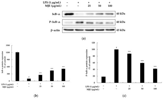 The effect of Mosla japonica extract (MJE) on the expression of IκB-α and phosphorylated IκB-α (P-IκB-α) proteins in lipopolysaccharide (LPS)-induced RAW 264.7 macrophage cells. Cells were treated with MJE (25, 50, and 100 μg/mL) and LPS (1 μg/mL) for 20 min. (a) Western blot analysis of IκB-α and P-IκB-α protein expression. (b,c) Quantification of IκB-α and P-IκB-α protein levels. Data are presented as mean ± SD from three independent experiments. Statistical significance: # p < 0.001 vs. unstimulated control, *** p < 0.001 vs. LPS-only group.