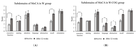Subdomains of MoCA scores at baseline and after exercise for 12 weeks: (A) W group; (B) W-COG group. * indicates p > 0.05, ** indicates p > 0.01, *** indicates p > 0.001.