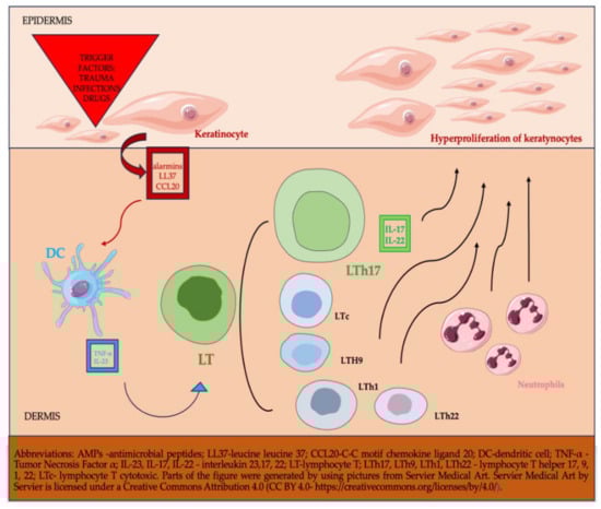 Important findings about psoriasis etiopathogenesis have been revealed in the last decades. So far, we know that multiple factors play major roles: environmental risk factors (e.g., infections, trauma, drugs), multiple inherited alleles, and immunologic factors [5,6]. Immunologically, psoriasis is the result of skin inflammation due to the uncontrolled functioning of both the innate and adaptative cutaneous immune systems. Although the clinical manifestations are the result of a complex interaction between multiple cells, cytokines, and chemokines, we can state that its major role is that of lymphocyte T helper (LTh) 17 cells, dendritic cells, and keratinocytic cells. Dendritic cell release Tumor Necrosis Factor (TNF)-α and interleukin (IL)-23, which determines lymphocyte T (LT) differentiation in LTh 17, which release IL-17 and IL-22. The interaction of these molecules leads to activation and hyperproliferation of keratinocytes and skin inflammation. Other cells involved in this complex mechanism of psoriasis’ pathogenesis are represented by neutrophils, cytotoxic cells, Th9, Th22, Th1 with all the cytokines and chemokines they secrete (Figure 1) [7,8,9].