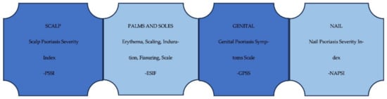 For special areas, different specific scores are used: Scalp Psoriasis Severity Index (PSSI), Nail Psoriasis Severity Index (NAPSI), Erythema, Scaling, Induration, Fissuring Scale (ESIF), Genital Psoriasis Symptoms Scale (GPSS), but none of them is included in the standard scores mentioned above (Figure 2) [4,17]. Also, a score was developed to measure the general psoriasis severity that includes patient-reported outcomes equally weighted with physician-assessed disease activity index scores: Brigham Scalp Nail Inverse Palmoplantar Psoriasis Composite Index [4,21,22].