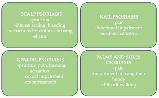 Psoriasis vulgaris is an important cause of social, psychological, and physical disability with a major impact on patients’ QoL. Quality of life is the most frequently patient-reported result in medical practice and can be defined in several complex ways, but when we refer to good health, first, we must take into consideration the patient’s physical and psychological status [35,36]. Even physical changes in different body areas, such as sensitive areas, are the ones that impact the patient’s life first, though perhaps psychological burden is the one that contributes most to the decline on QoL, patients frequently facing a loss of confidence, the perception of being stigmatized, anxiety, and depression. There is an interdependence between a patient’s mental status and his clinical manifestation with a negative effect on QoL [37,38]. Very often patients with psoriasis, including special sites, experience unmanageable clinical manifestations of the disease, social isolation, difficult interpersonal relationships, or even fear of transmitting their disease to their children [14,34,39].