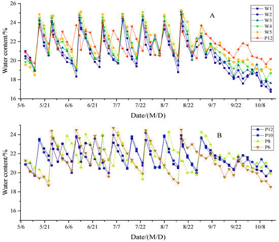 Dynamics of average water content in 0–80 cm soil layer under different irrigation quantities (A) and irrigation frequencies (B). W1, W2, W3, W4 and W5 represent irrigation of 300, 375, 450, 525 and 600 mm for mulch-free cotton, and WCK represents irrigation of 450 mm for filmed cotton.P12, P10, P8, and P6 represent drip irrigation for 12, 10, 8, and 6 times, respectively.