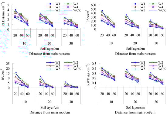 It can be seen from Figure 2 that the characteristic values of the root growth of mulch-free cotton decrease with the deepening of the soil layer and the increase in distance from the main root, and the values among the irrigation amount treatments are W2 > W3 > W4 > W5 > W1, in which the average RLD, RSA, RV, and RWD of W2 are the largest, and the average characteristic values of W2 in each soil layer and at different distances from the main root are also the largest, followed by W3 and W1. Compared with other treatments, the RLD of W2 periphery (30 cm from the main root) and middle layer (20–40 cm soil layer) increased by 24.57–106.67% and 14.99–94.55%, the average proportion of RSA in total RSA increased by 1.64–3.41 and 0.49–4.09 percentage points, and the average proportion of RV in total RV increased by 1.00–2.54 and 0.09–4.52 percentage points. The RLD of W3 increased by 19.41–65.91% and 17.69–69.19% compared with other treatments (except W2). The proportion of average RSA in total RSA in W3 deep layer (40–60 cm soil layer) was 0.27–1.20 percentage points higher than that in other treatments, and the proportion of average RV in total RV was 1.11–2.12 percentage points higher than that in other treatments. The average RLD of WCK was the largest, but there was no significant difference with W3. The total RSA and average RV and RWD of WCK were 1564.41 cm2, 44.98 cm3, and 0.24 g·cm−3, respectively, which were second only to W2. In addition, the root distribution of WCK at 30 cm away from the main root was second only to W2, and its RLD, RSA, RV, and RWD increased by 1.89–69.05%, 26.27–156.36%, 12.70–296.87%, and 2.31–34.14% compared with the treatment without a membrane (except W2), respectively. The root distribution of WCK was the least in the 40–60 cm soil layer, and its RLD, RSA, RV, and RWD decreased by 44.88–166.90%, 61.69–303.00%, 72.05–484.18%, and 25.41–80.92% compared with the treatment without a membrane, and increased by 10.09–76.45%, 16.60–152.88%, 22.43–263.99%, and 8.58–60% in the 0–20 cm soil layer. Therefore, mild water deficit (W2) and suitable water (W3) can expand the distribution range of cotton roots in soil; excessive drought (W1) is unfavorable to root growth, while film mulching planting mainly promotes the development of cotton surface and peripheral roots, which is not conducive to deep water and nutrient absorption.