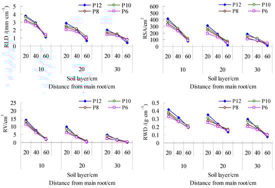 It can be seen from Figure 3 that the average RLD and RSA of different soil layers during the whole period between the irrigation frequency treatments are P10 > P12 > P8 > P6, and P10 increases by 0.35% and 2.37% compared with P12, with little difference, and increases by 6.02% and 15.28% and 13.36% and 28.30% compared with P8 and P6, with obvious difference. The RV and RWD are P12 > P10 > P8 > P6, and P12 increases by 2.91% and 2.76% compared with P10, with little difference, and increases by 21.23% and 10.82% and 32.11% and 18.74% compared with P8 and P6, with obvious difference. It can be seen that the P12 and P10 treatments can effectively increase the number of roots, which is beneficial to root growth. From the perspective of root spatial distribution, each characteristic value in the 40–60 cm soil layer was P10 > P8 > P6 > P12, and that 30 cm away from the main root was P10 > P12 > P8 > P6, indicating that the P10 treatment had deeper and more peripheral roots, and the root range was the largest.