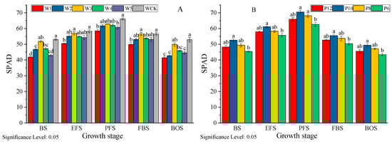 Effects of different irrigation quantities (A) and irrigation frequencies (B) on the relative chlorophyll content (SPAD) of mulch-free cotton. BS, EFS, PFS, FBS, and BOS, respectively, represent the budding stage, early flowering stage, peak flowering stage, full boll stage, and boll opening stage. Different lowercase letters in the same column indicate significant differences between different irrigation treatments at the same time (p < 0.05).