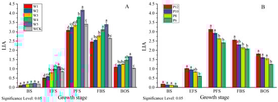 LAI dynamics of mulch-free cotton under different irrigation quantities (A) and irrigation frequencies (B). BS, EFS, PFS, FBS, and BOS, respectively, represent the budding stage, early flowering stage, peak flowering stage, full boll stage, and boll opening stage. Different lowercase letters in the same column indicate significant differences between different irrigation treatments at the same time (p < 0.05).