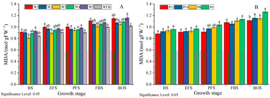 Effects of different irrigation quantities (A) and irrigation frequencies (B) on the MDA content of mulch-free cotton.BS, EFS, PFS, FBS, and BOS, respectively, represent the budding stage, early flowering stage, peak flowering stage, full boll stage, and boll opening stage. Different lowercase letters in the same column indicate significant differences between different irrigation treatments at the same time (p < 0.05).