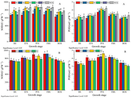 Effects of different irrigation quantities (A) and irrigation frequencies (B) on SOD and POD activities of mulch-free cotton. BS, EFS, PFS, FBS, and BOS, respectively, represent the budding stage, early flowering stage, peak flowering stage, full boll stage, and boll opening stage. Different lowercase letters in the same column indicate significant differences between different irrigation treatments at the same time (p < 0.05).
