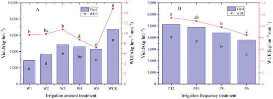 Effects of different irrigation quantities (A) and irrigation frequencies (B) on seed cotton yield and WUE of mulch-free cotton. W1, W2, W3, W4 and W5 represent irrigation of 300, 375, 450, 525 and 600 mm for mulch-free cotton, and WCK represents irrigation of 450 mm for filmed cotton. P12, P10, P8, and P6 represent drip irrigation for 12, 10, 8, and 6 times, respectively. The different lowercase letters indicate significant differences between treatments (p < 0.05).