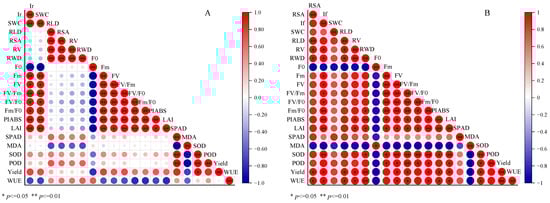 Correlation between soil moisture, root growth, physiological performance, yield, and WUE under different irrigation amounts (A) and irrigation frequencies (B). In the above figure, Ir: Irrigation volume, If: Irrigation frequency, SWC: Soil water content, RLD: Root length density, RSA: Root surface area, RV: Root volume, RWD: Root weight density, F0: Initial fluorescence, Fm: Maximum fluorescence, FV: Variable fluorescence, FV/Fm: Maximum photochemical efficiency, FV/F0: Potential photochemical activity of PSII, Fm/F0: Electron transfer of PSII, PLABS: Photosynthetic performance index based on light absorption, LAI: Leaf area index, SPAD: Relative chlorophyll content, MDA: Malondialdehyde content, SOD: Superoxide dismutase activity, POD: Peroxidase activity, Yield: Production, WUE: water use efficiency.