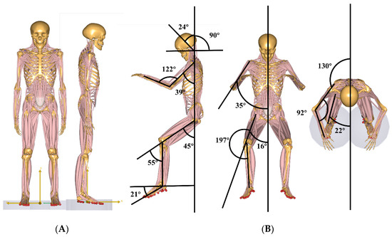The static kinematic parameters for the NBP 1G and SM 0G postures were derived from the original kinematics of the Standing Model in the AMMR database of the Anybody Modeling System. Specifically, the parameters were sternoclavicular joint protraction 23°, sternoclavicular joint elevation 11.5°, shoulder joint flexion 8°, shoulder abduction 10°, elbow joint flexion 8°, elbow joint pronation −20°, hip flexion −6°, hip abduction 5°, with all other joint angles set to 0° (see Figure 1A).