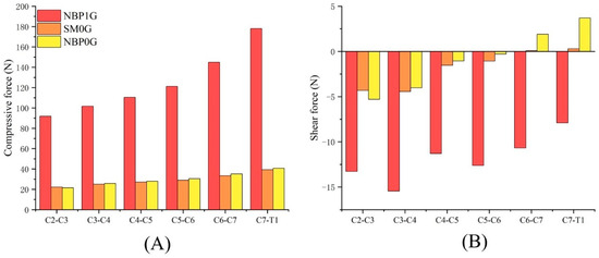 Under NBP 1G, the compressive forces for the C2–C3, C3–C4, C4–C5, C5–C6, C6–C7, and C7–T1 discs were 91.83 N, 101.69 N, 110.37 N, 121.15 N, 144.87 N, and 178.07 N, respectively. The shear forces for these discs were −13.27 N, −15.44 N, −11.29 N, −12.61 N, −10.67 N, and −7.9 N, respectively (Table S1).