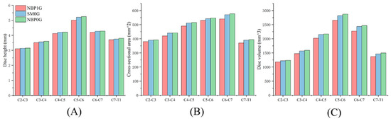 Under NBP 1G, the disc heights for the C2–C3, C3–C4, C4–C5, C5–C6, C6–C7, and C7–T1 levels were 3.1 mm, 3.51 mm, 4.12 mm, 5.01 mm, 4.2 mm, and 3.7 mm, respectively. The cross-sectional areas were 380.00 mm2, 420.00 mm2, 490.00 mm2, 530.00 mm2, 540.00 mm2, and 370.00 mm2, respectively. The disc volumes were 1178 mm3, 1474.2 mm3, 2018.8 mm3, 2655.3 mm3, 2268 mm3, and 1369 mm3, respectively (Table S2).