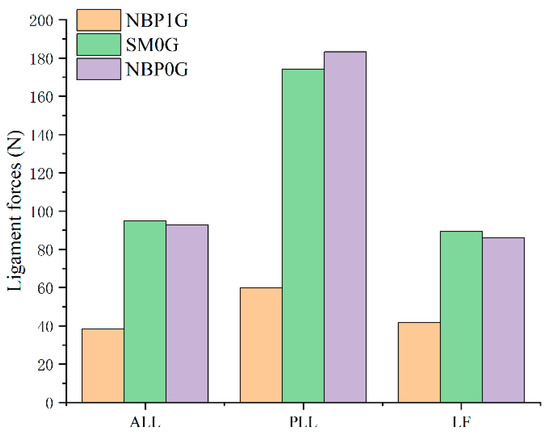 In SM 0G, the forces on the ALL and LF were greater than those in NBP 0G. Compared to NBP 0G, the forces on the corresponding ligaments in SM 0G increased by 2.4% and 3.9%, respectively. However, the force on the PLL in SM 0G was lower than that in NBP 0G, with a decrease of 4.9%.