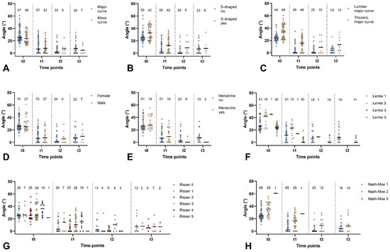 Cobb angle data from standing radiographs at t0 (pre-bracing) and from in-brace radiographs in the supine position for all follow-up time points (t1: 6–12 months, t2: 13–24 months, and t3: 25–36 months) during treatment with the Charleston Bending Brace. Data are presented as the distribution of individual values. The median is indicated by a black line, and the numbers on top of each column represent the sample size. The data are depicted separately according to the defined groups, as indicated in the legends of the graphs for (A) the major or minor curve, (B) the diagnosis of s-shaped scoliosis, (C) the curve type of the major curve, (D) gender, (E) the onset of menarche, (F) the Lenke classification, (G) the Risser stage, and (H) the Nash–Moe classification.