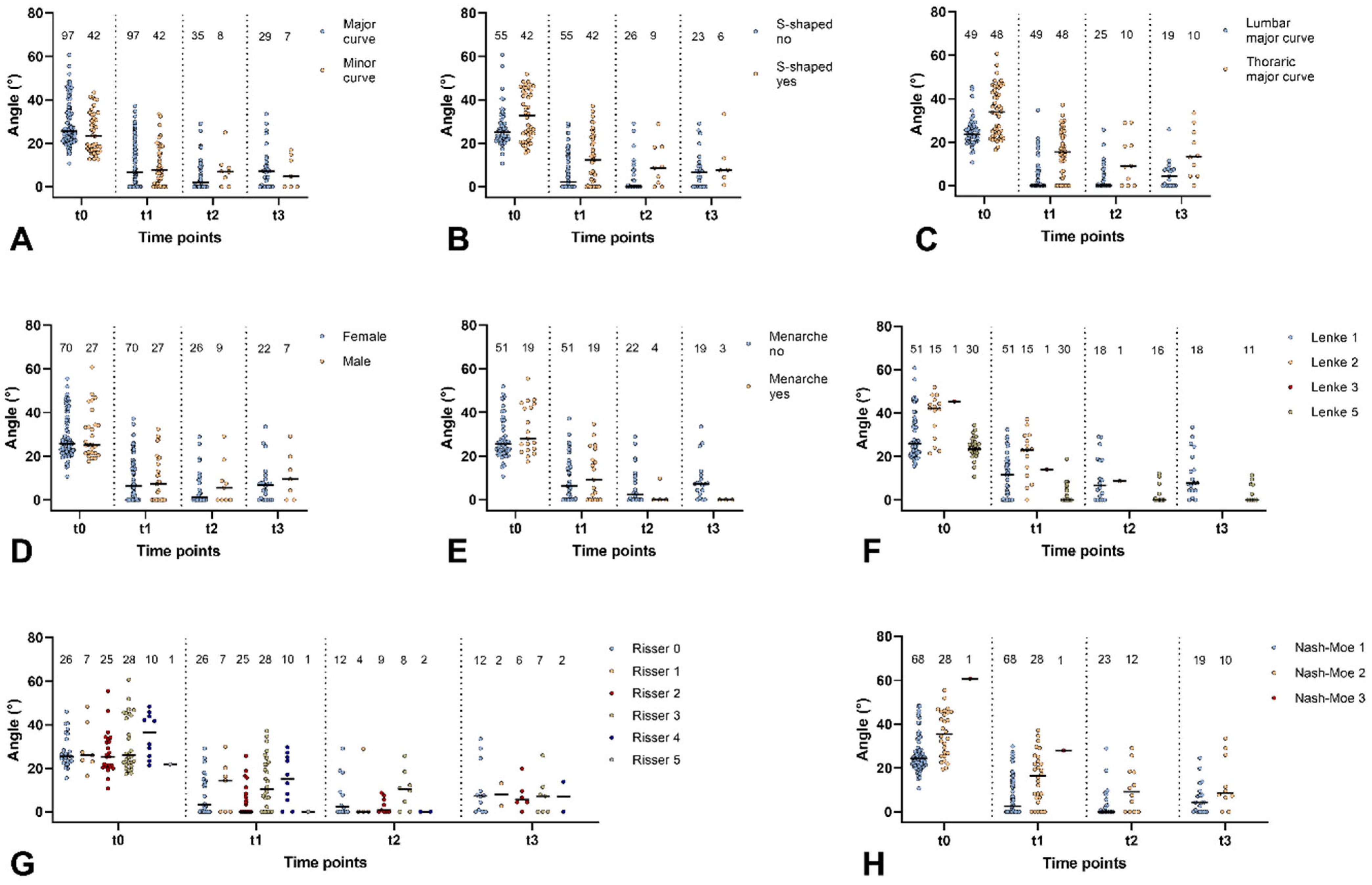 3.2. Group-Specific Primary Curve Correction After t1 in the Brace