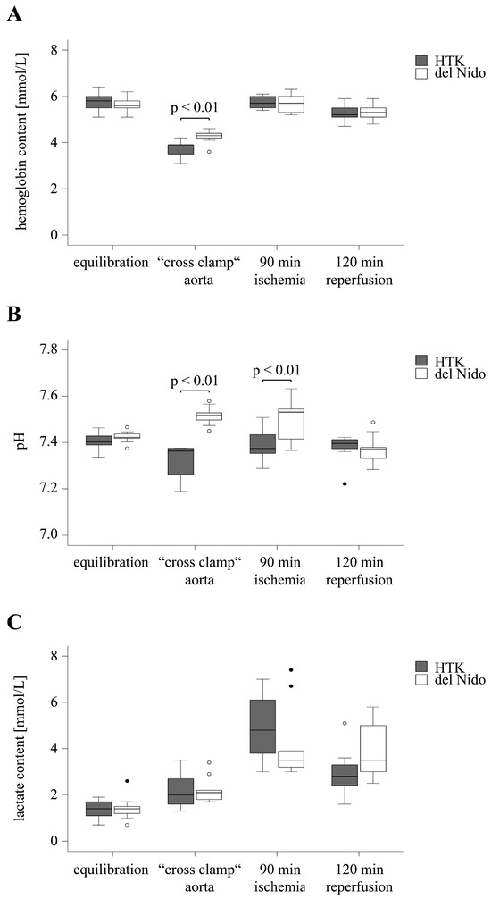 The hemoglobin content was comparable between both groups during equilibration (HTK: 5.8 ± 0.4 mmol/L, del Nido: 5.6 ± 0.3 mmol/L, p = 0.43). At the beginning of the ischemic period, a reduction in hemoglobin was observed in both groups, with a significantly lower content in the HTK group compared to the del Nido group (HTK: 3.7 ± 0.4 mmol/L, del Nido: 4.2 ± 0.3 mmol/L, p < 0.01). The hemoglobin content returned to baseline level at the end of ischemia (HTK: 5.7 ± 0.3 mmol/L, del Nido: 5.7 ± 0.4 mmol/L, p = 0.75) and during the reperfusion period (HTK: 5.3 ± 0.4 mmol/L, del Nido: 5.3 ± 0.3 mmol/L, p = 0.90) (Figure 1A).