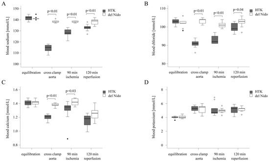 In summary, HTK cardioplegia induced a decrease in blood sodium, chloride, and calcium concentration compared to the more stable physiological electrolyte concentrations during del Nido cardioplegia. Hyponatremia and hypochloremia persisted after 120 min of reperfusion in the HTK group.