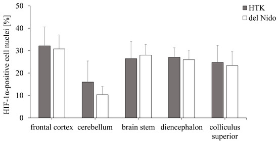 The brain is most sensitive to alterations in oxygen delivery and has evolved various adaptive mechanisms to respond rapidly to hypoxia [20]. HIF-1 is a heterodimeric protein complex that is continually synthesized but rapidly degraded under normoxic conditions. In response to low oxygen, a component of HIF, the transcription factor HIF-1α, accumulates in hypoxic cells, translocates into the nucleus, and regulates the activation of a broad range of target genes involved in angiogenesis, cell proliferation, and cell death [21,22]. Rodent studies have demonstrated the induction of the HIF-1α gene and protein expression under hypoxic or ischemic conditions in the brain. Experimental evidence showed increased HIF-1α expression 1 h after systemic hypoxia due to cardiac arrest, elevated levels over 12 h, and persistence for at least 7 d after transient global cerebral ischemia [23]. Therefore, we investigated the HIF-1α nuclear translocation after temporary ischemia induced by cardiac arrest and altered the blood flow conditions in the brain. In our study, HTK- and del Nido-induced cardioplegia resulted in a comparable degree of HIF-1α mRNA expression and nuclear translocation in the analyzed brain regions. It should be noted that the regulation of HIF-1α protein expression under hypoxia occurs primarily post-translationally through the inhibition of proteasomal degradation, whereas transcriptional mechanisms are still under debate [22]. Thus, it can be concluded that the degree of oxidative stress and hypoxic effects induced by cardiac arrest is comparable between HTK- and del Nido-induced cardioplegia.