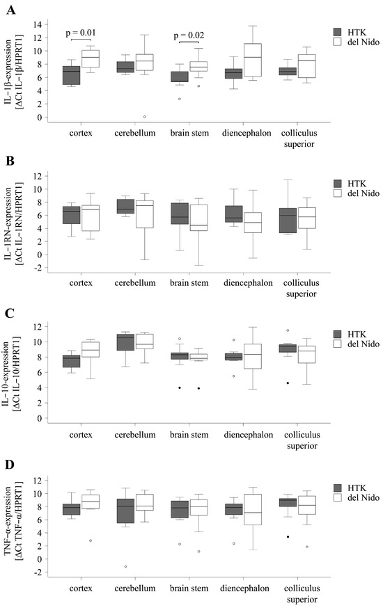 To assess inflammatory processes, the mRNA expression of pro- and anti-inflammatory cytokines IL-1β, TNF-α, IL-1RN, and IL-10 was analyzed in different brain regions. The group comparison revealed comparable expression in the cerebellum (p = 0.80), diencephalon (p = 0.06), and colliculus superior (p = 0.23) and a higher expression of proinflammatory IL-1β in the frontal cortex (HTK: ∆Ct6.5 ± 1.7; del Nido: ∆Ct8.8 ± 1.5, p = 0.01) and in the brain stem (HTK: ∆Ct5.7 ± 1.5; del Nido: ∆Ct7.5 ± 1.6, p = 0.02) of the HTK group (Figure 4A).