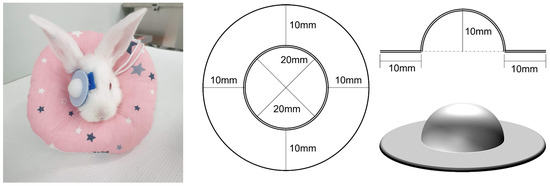 The eyes of the rabbit kits first opened at approximately 12 days of age. At 14 days of age, rabbits confirmed to be eyes open were fitted with a removable opaque diffuser over the right eye and worn for 4 weeks. The diffuser design and application protocol were adapted from those used in the guinea pig study [36]. The diffuser was 3D printed using polylactic acid, a bioplastic material. The diffuser comprised a semicircular dome and a ring-shaped hook-and-loop fastener, and another hook-and-loop fastener was placed in a ring around the rabbit’s eyes and attached with cyanoacrylate adhesive. This fastener was additionally fixed with 5-0 prolene (Figure 1).