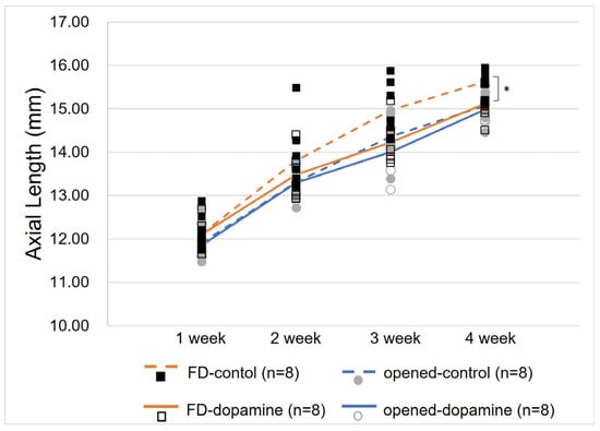 The axial lengths of each group by age are described in Table 1. A comparison of the dopamine group and the control group revealed no significant difference in the axial length of the contralateral opened eye between the two groups (14.98 ± 0.29 mm, 15.07 ± 0.34 mm, respectively, p = 0.328). However, the axial length of the FD eye was found to be significantly shorter in the dopamine group than in the control group (15.12 ± 0.36 mm, 15.63 ± 0.33 mm, respectively, p = 0.015) (Figure 2).