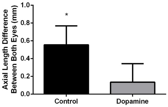 Axial length differences between both eyes after treatment. Significant axial length differences between both eyes were observed in the control group (p = 0.012, Wilcoxon signed rank test), whereas the dopamine group showed no significant difference in both eyes, indicating that topical dopamine application effectively inhibited myopia growth in the dopamine group (p = 0.123, Wilcoxon signed rank test). * p value < 0.05 by Wilcoxon signed rank test.