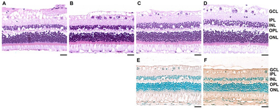The TdT-mediated dUTP Nick-End labeling (TUNEL) assay was employed to detect apoptosis in the retina. TUNEL staining was conducted using a commercially available in situ apoptosis detection kit (ab206386; Abcam, Cambridge, UK) in accordance with a protocol adapted from the previous study [38] and the manufacturer’s instructions. Briefly, paraffin sections were deparaffinized in xylene and rehydrated in a graded alcohol series prior to treatment with proteinase K. 3% H2O2 was then added to inactivate the endogenous peroxidases. Apoptotic cells were labeled with terminal deoxynucleotidyl transferase, which catalyzes the addition of biotin-labeled deoxynucleotides, followed by incubation with a streptavidin-horseradish peroxidase conjugate. The signal was detected with 3,3′-diaminobenzidine substrate, and the sections were counterstained with methyl green.