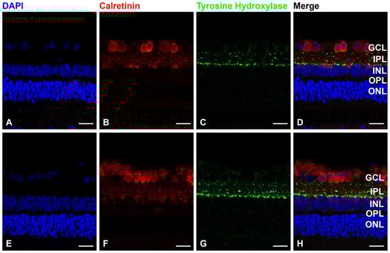Immunohistochemistry was performed to detect the impact of dopamine instillation on dopaminergic amacrine cells [39]. The primary antibodies, mouse anti-tyrosine hydroxylase (monoclonal, MA1100, 1:100; Boster Bio, Pleasanton, CA, USA) and rabbit anti-CALB2 (polyclonal, PAB7957, 1:100; Abnova, Taipei, Taiwan), were incubated overnight at 4 °C. Subsequently, an incubation was conducted at room temperature for one hour with the secondary antibody, Alexa-488 donkey anti-mouse or Alexa-594 donkey anti-rabbit IgG (1:200). DAPI stain (F6057; Fluoroshield, Sigma-Aldrich, Livonia, MI, USA) was used for nuclear staining.