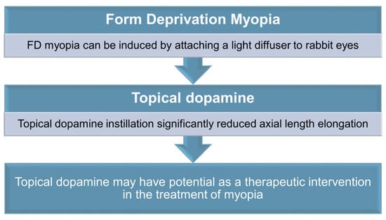 In conclusion, FD myopia can be induced by attaching a light diffuser to rabbit eyes. Furthermore, topical administration of dopamine eyedrops inhibits the development of experimental FD myopia without causing ocular toxicity. These findings indicate that topical dopamine may have potential as a therapeutic intervention for myopia (Figure 6).