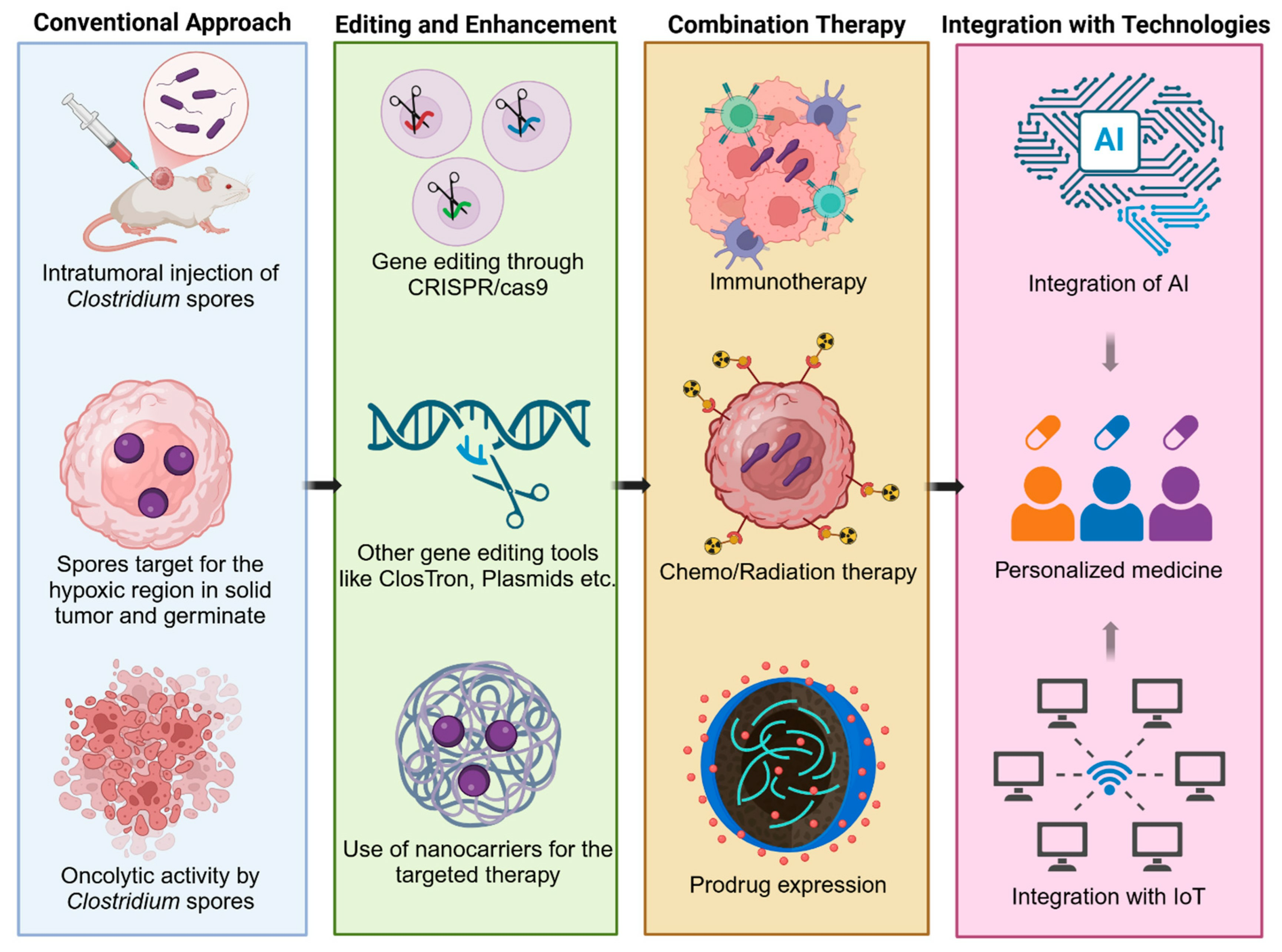 Gene therapy involves the incorporation of correct genetic material into target cells to achieve therapeutic effects. Genetic modification has enabled the development of multiple therapeutic approaches. Various efforts have been made to exploit Clostridium for its hypoxic ability. The most prominent example of gene modification is the α-toxin in C. novyi. This toxin has been removed to create a non-toxic strain, denoted as NT in C. novyi-NT. This modification facilitates the successful colonization of tumor cells in oxygen-deprived regions while preserving nearby healthy cells. Gene modification has also enabled immunotherapy using Clostridium. Recently, Clostridium-directed antibody therapy (CDAT) has gained prominence to produce high-specificity antibodies against tumor antigens through gene modification. In a recent study, C. acetobutylicum DSM792 was engineered to express and secrete TNF-α. However, due to the low colonization of this bacterium, no therapeutic results were obtained. Nonetheless, IL-2 expression successfully reduced tumors while avoiding systemic toxicity [32].