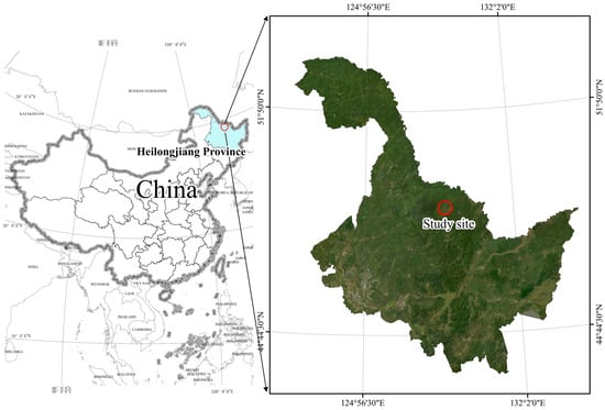 The study area is located in the Hongxing National Nature Reserve (Figure 1), within the Lesser Khingan Mountains, situated in the northeast of Heilongjiang Province, China (128°21′40″~128°53′30″ E and 48°41′20″~49°11′00″ N). Covering an area of 111,995.3 hectares, the reserve experiences a northern temperate continental monsoon climate, characterized by an annual average temperature of −0.7 °C, an average precipitation range of 500–610 mm, and an average relative humidity of 71.1%. The Hongxing National Nature Reserve is notable for its high biodiversity, encompassing a range of ecosystems including typical water, swamp, meadow wetland, shrub, and forest vegetation. The reserve is home to 1929 species, among which 885 are plant species and 197 are bryophytes distributed across 49 families. Additionally, the reserve contains 38 species of ferns from 11 families and 650 species of seed plants from 88 families [33]. The wetland park within the reserve is categorized into seven types of wetlands: rivers, flood plains, herbs, mosses, swamp meadows, shrub swamps, and forest swamps. The primary landscape of the park is dominated by herb and swamp meadow wetlands, which are surrounded by agricultural lands.