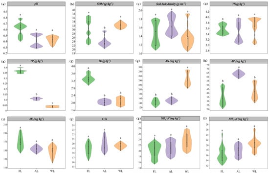 Soil properties under different land use patterns. Abbreviations: (a) pH, soil pH values. (b) SOM, soil organic matter. (c) SBD, Soil bulk density. (d) TN, total nitrogen. (e) TP, total phosphorus. (f) TK, total potassium. (g) AN, available nitrogen. (h) AP, available phosphorus. (i) AK, available potassium. (j) C:N, the ratio of total C and total N. (k) NO3−-N, nitrate nitrogen. (l) NH4+-N, ammonium nitrogen. FL, forestland. AL, arable land. WL, wetland. Significant differences among treatments are indicated in different lowercase letters (p < 0.05).