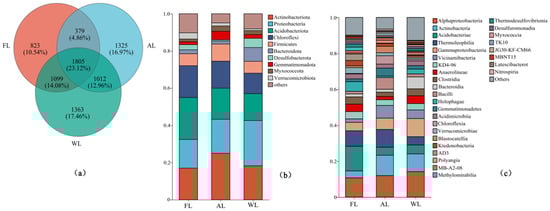 Composition of soil microbial communities under different land use patterns. (a) Venn diagram of soil microorganisms based on the level of OTUs. (b) Relative abundance of soil bacterial communities under different land uses at the phylum level. (c) Relative abundance of soil bacterial communities under different land uses at the class level. Abbreviations: FL, forestland. AL, arable land. WL, wetland.